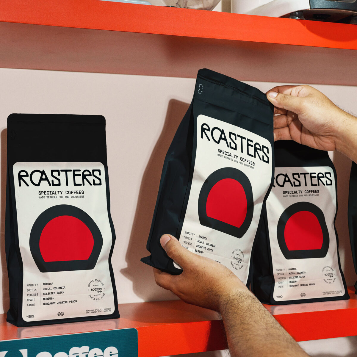 Designing coffee packaging requires conveying origin, quality, and character at first glance while standing out on shelf. For ROASTERS, the approach was to translate sourcing and terroir into a clear and authentic visual language. The brand’s focus on limited micro-lots, organic beans, and precise roasting shaped the conceptual foundation, inspiring an identity rooted in landscape and craft. The visual system combines minimalism with strong expression: a bold typographic logo structures the composition, while a warm yellow and deep red palette evokes sun, heat, and earth, creating immediate impact and coherence across the range. A subtle typographic detail, the O sliding behind the A, introduces a narrative dimension, echoing a sun setting behind mountains. The result is a scalable and distinctive packaging system that balances clarity and premium positioning, capturing the essence of coffee shaped by its environment.