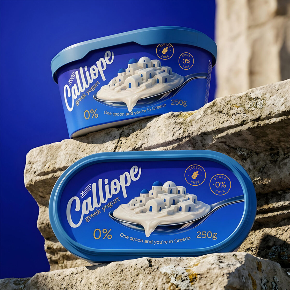 This packaging design is built around a simple yet profound idea: to convey a truly Greek experience, right from the first spoonful. The deep, rich blue is not just a color, but a feeling: it evokes the depth of the sea, the vastness of the sky, and the purity that characterizes high-quality dairy products. The choice of this color also creates a strong contrast with the white yogurt, emphasizing its naturalness and freshness.